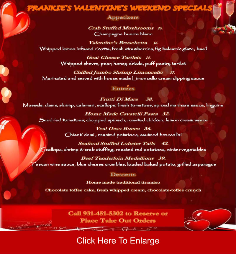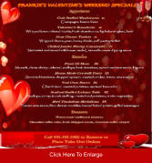 Frankie's Pizza & Grill features a diverse menu that offers something for everyone. The restaurant features traditional Italian dishes, hand tossed, thin crust pizza, fresh grilled entrees and burgers, popular salads and unique appetizers.
